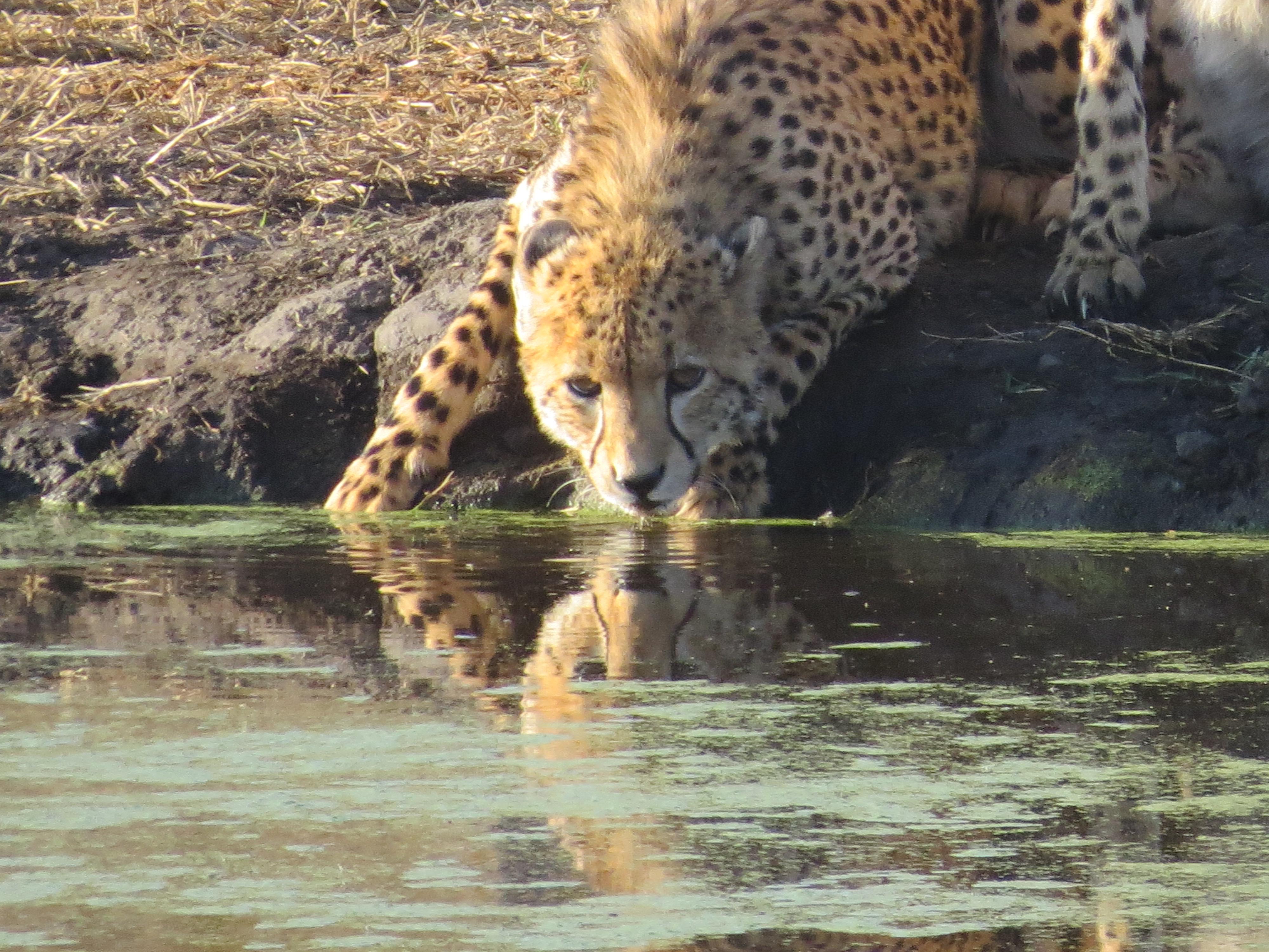 It got to 7.00 and we were about to set off on our morning drive, when we noticed that two of our party were missing. They had obviously overslept. There was much tut-tutting, as we boasted proudly how we had braved the morning frost (I exaggerate, but barely) to get to breakfast on time. Someone went to wake them up, while we huddled round the fire drinking more tea and trying to get warm. Our sensational guide Peter was getting slightly upset, because we were missing the best time of the day to find big cats, but we were assured that the errant guests would arrive soon. They did, and as they scrambled to have a quick bite before we set off, there was only a little righteous looking at watches. As the late-comers rushed to finish their meagre breakfast, somebody said "Look!" The waterbuck and impala that had been drinking at the watering-hole moments before, had fled. And arriving, in a nice parade right in front of us, was the cheetah family from the previous day
